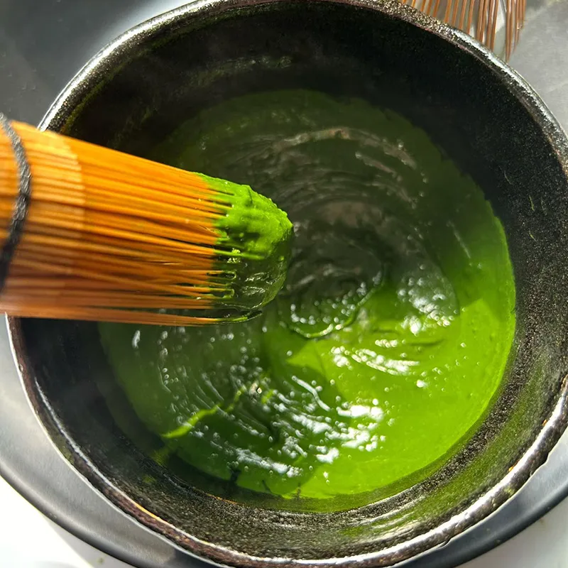 Place a small amount of matcha in a tea bowl, add a small amount of warm water and stir well